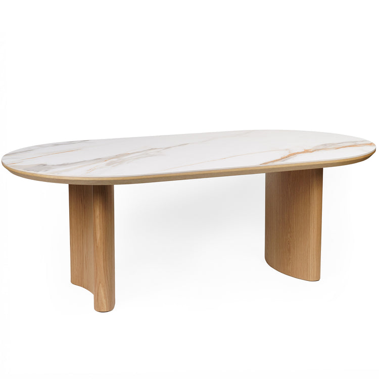 Transform your dining experience with our exquisite 'Caspian' dining table, crafted with high-quality ash timber veneer and ceramic. The elegant curved base adds a touch of sophistication and charisma, making it the focal point of any dining space. The stunning ceramic top perfectly complements the ash veneer, creating a perfect balance of durability and beauty.